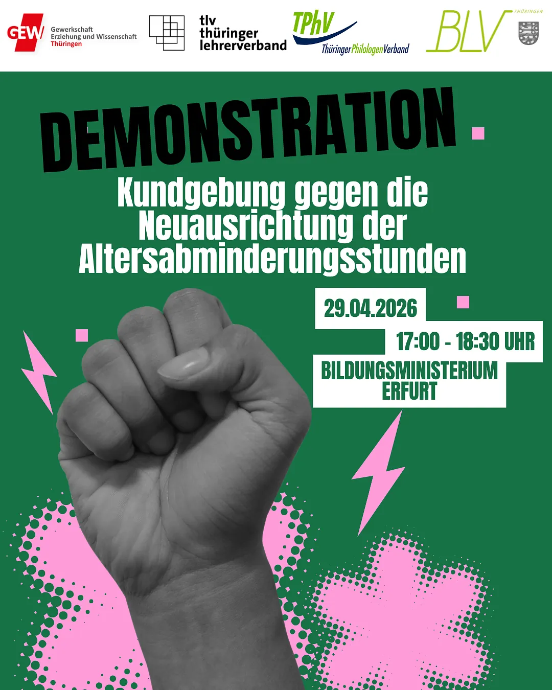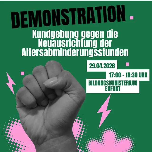 Das TMBWK plant in seinem Maßnahmepaket zur Unterrichtsabsicherung für das Schuljahr 2026/27 die Verschiebung der Altersgrenze zur Gewährung der Altersabminderungsstunden vom 55. Auf das 60. Lebensjahr. Da keine Übergangsregelung für unsere Kolleginnen und Kollegen, welche derzeit zwischen 55 und 59 Jahre alt sind, geplant ist, führt dies zu einer deutlichen Verschlechterung deren Arbeitsbedingungen. Das wollen Gewerkschaften und Verbände im Schulbereich, auch der BLV, nicht hinnehmen und rufen deshalb zu dieser Kundgebung auf. Der Staatssekretär Herr Bernd – Uwe Althaus hat sein Kommen zugesagt.